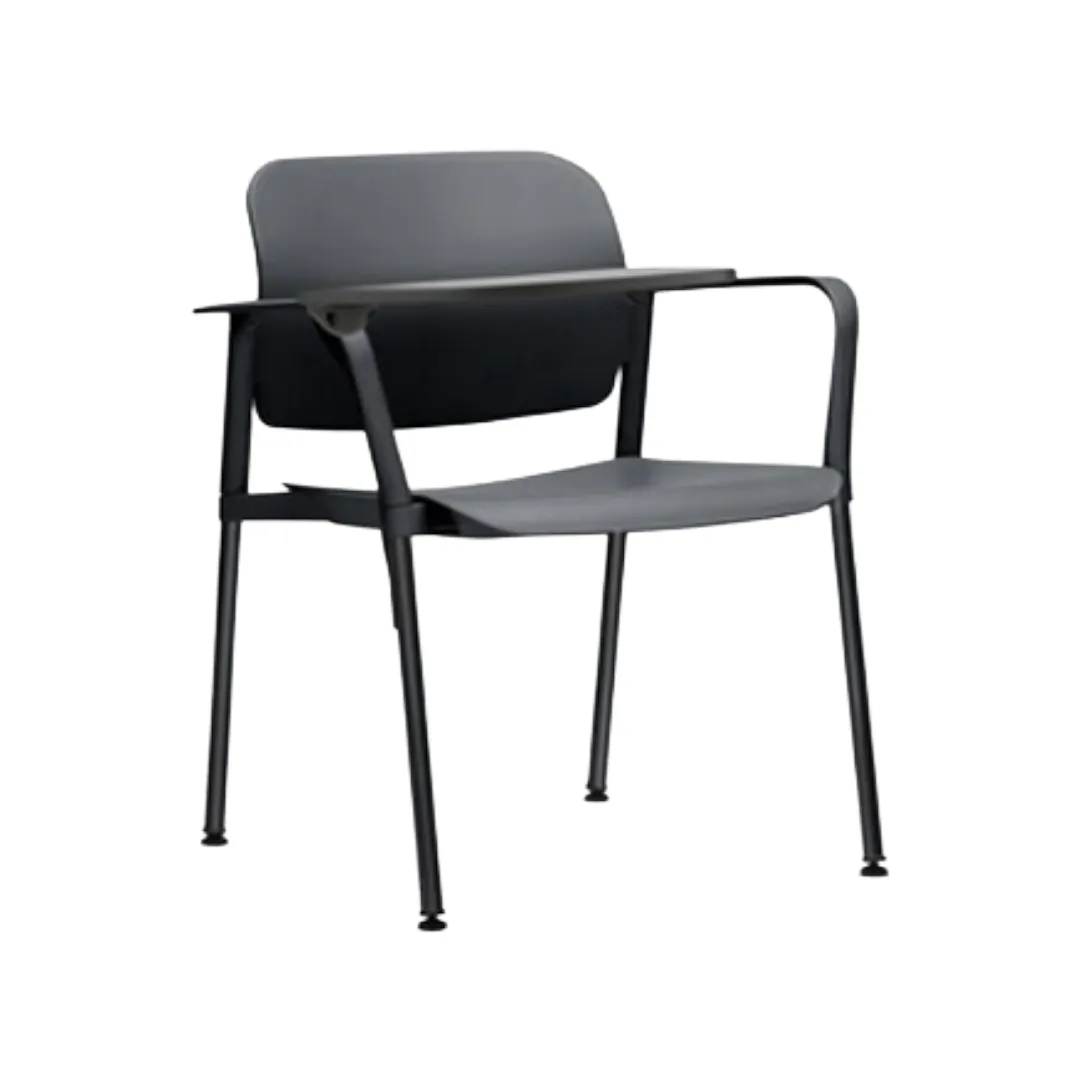 Possui estrutura metálica resistente, assento e encosto ergonômicos, braços fixos e prancheta acoplada, oferecendo praticidade para anotações durante as atividades. O design permite empilhamento seguro, facilitando o armazenamento e otimização de espaço.