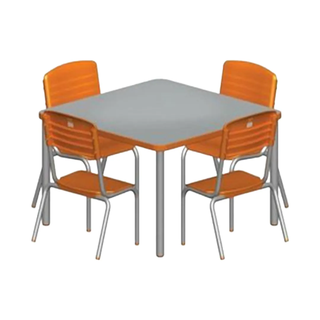 Conjunto coletivo escolar composto por 1 mesa e 4 cadeiras, ideal para salas de aula e ambientes de aprendizado infantil. Estrutura resistente e durável, com tampo em MDP/MDF laminado e cadeiras anatômicas em polipropileno injetado, pigmentadas na cor laranja.