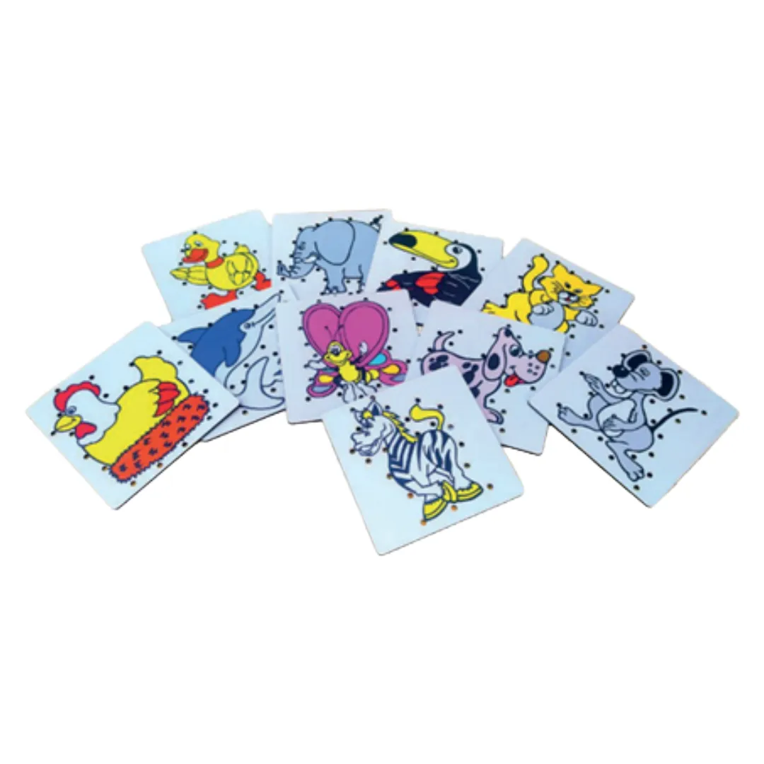 O Kit Alinhavos Animais é um recurso educativo desenvolvido para crianças, confeccionado em MDF 0,28 cm e composto por 10 bases perfuradas medindo 16×16 cm, com fundo branco ultravioleta e ilustrações de animais sortidas. O kit acompanha 10 cadarços coloridos de poliéster com aproximadamente 70 cm, ideais para alinhar as figuras das bases, estimulando a coordenação motora fina e o aprendizado lúdico de cores e formas.