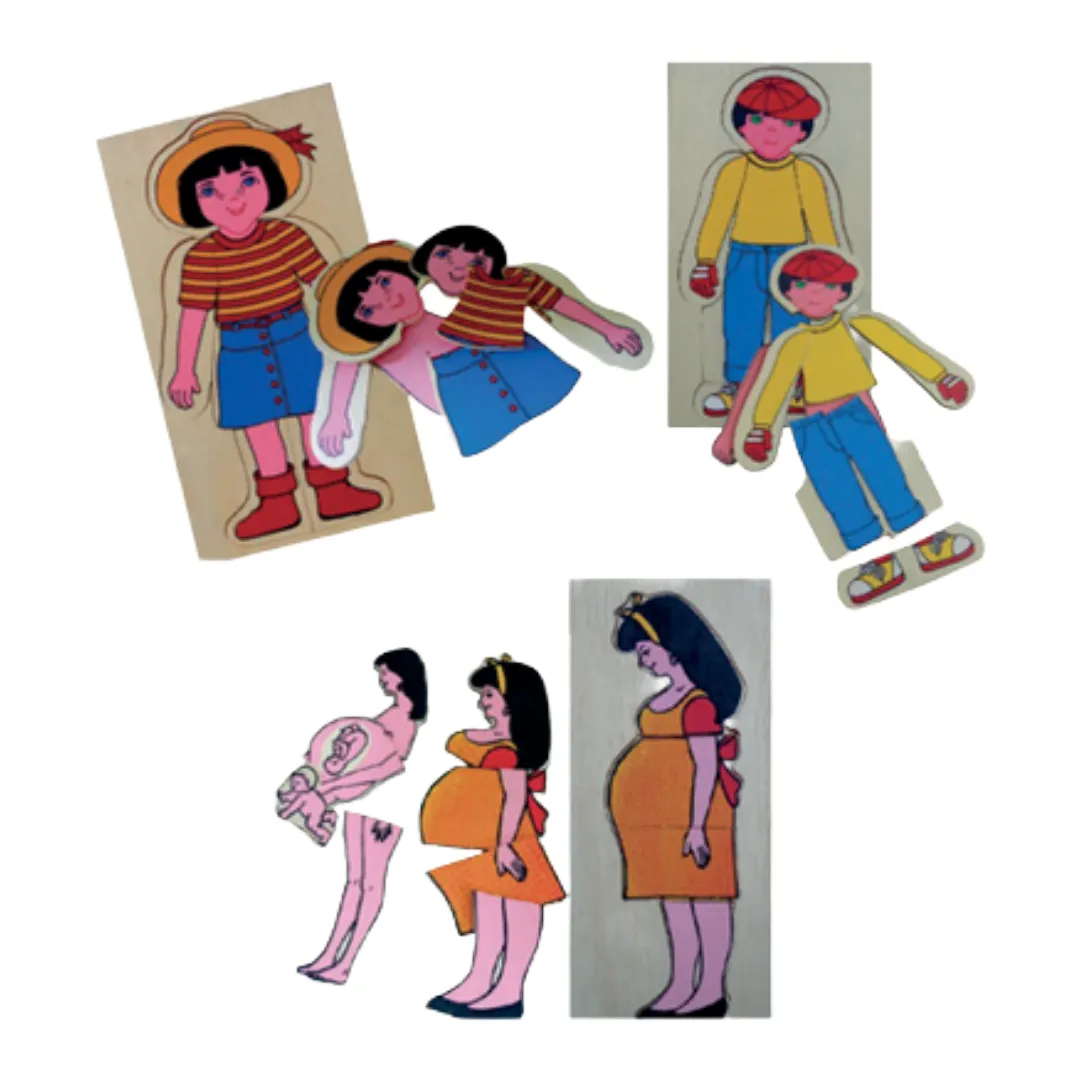 O Kit Esquema Corporal é um brinquedo educativo confeccionado em madeira Paricá de 10 mm, com prancha vazada e recortada, serigrafada com o tema de menina, menino e gestante. Cada peça representa as fases do corpo humano, auxiliando crianças no aprendizado sobre anatomia, diferenças de gênero e desenvolvimento humano de forma lúdica e segura. Produto 100% artesanal, utilizando tinta à base de água.