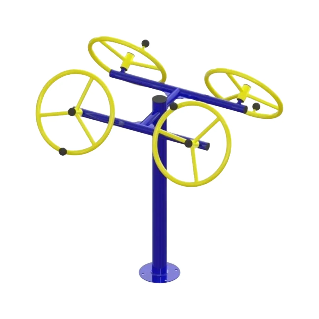 O Volante de Rotação Diagonal Duplo é um equipamento de academia ao ar livre voltado para o fortalecimento da musculatura dos ombros, braços e costas, com foco no trabalho da mobilidade articular. Diferente do volante vertical, este modelo possui os eixos em posição diagonal, oferecendo um movimento diferenciado que amplia a amplitude articular e melhora a coordenação motora. Pode ser utilizado por dois usuários simultaneamente, tornando-se ideal para áreas coletivas como praças, parques e espaços públicos.